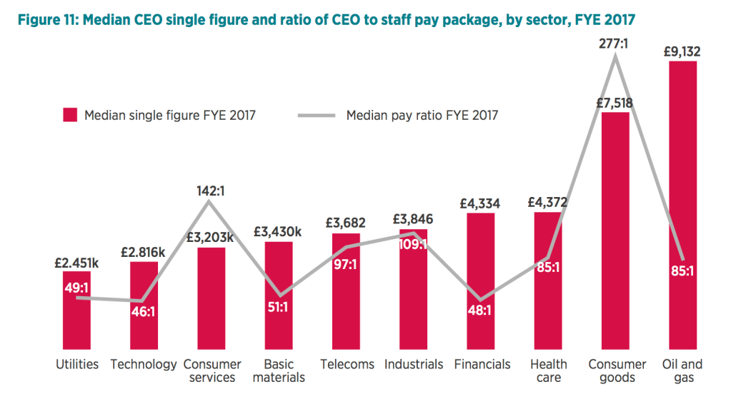 I’m sure that there is nothing too surprising in this chart, but I will draw your attention to two things. First, the right-hand side, the two most generous paying sectors – oil and gas and consumer goods. It seems relevant to note that in those sectors the UK has companies that genuinely are global competitors (BP and Shell, and Unilever and Reckitt Benckiser or RB, respectively) and so compete with US rivals; there is a marked contrast in the pay levels with, say the utilities sector, which is a UK domestic industry. The second thing to note is that the ratio is driven less by the pay of the CEO than by the nature and structure of the businesses in question. For example, consumer services, which has a high spike in the ratio, includes retail where we know there are many part-time workers and many who are low-paid; in contrast, the financial sector ratio is much lower because as we know many in financial services are tremendously well-paid.