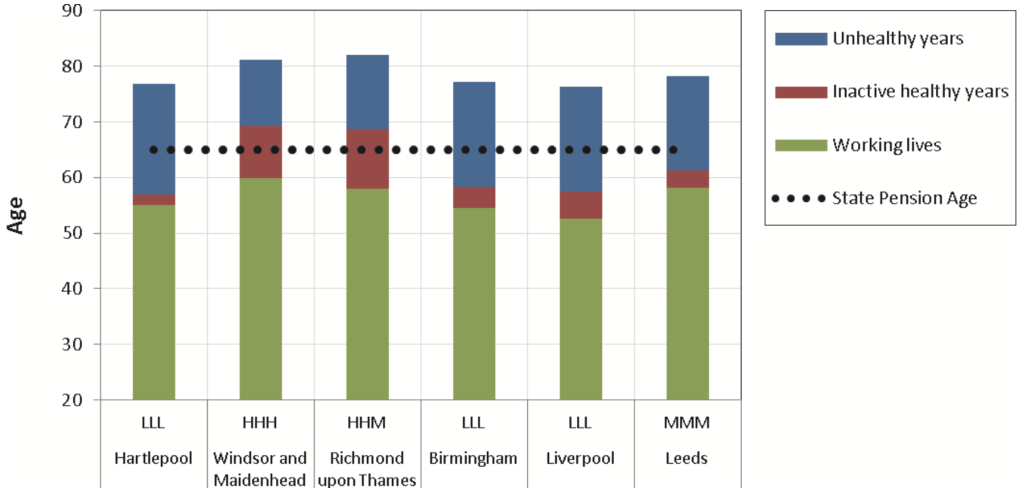 The opportunity from this is clear – or perhaps what is more clear is the opportunity cost of not taking these steps. Poor diets build up problems for later life and are one of the major drivers of poor health in older age. An excellent recent paper The Cost of Inequality – putting a price on health from the thoughtful people at CSFI tries to identify the fiscal drag from poor health outcomes in older age, highlighting the discrepancies in the experience of old age between different parts of the UK. It notes that the end of life is usually preceded by years of poor health, but before that there are healthy years after work (what the report calls inactive healthy years). The date boundaries between these and working life are highly variable across the country, dependent on relative poverty and other factors, as this chart shows: