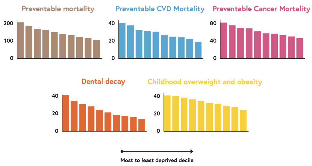 “People living in the most deprived decile are almost twice as likely to die from all preventable causes, compared to those in the richest decile. They are 2.1 times more likely to die from preventable heart disease; 1.7 times more likely to die from preventable cancer; and 3 times more likely to have tooth decay at age 5. Their children are nearly twice as likely to be overweight or obese at age 11.” Covid [CVD on the chart] mortality is double amongst those from the most deprived areas.