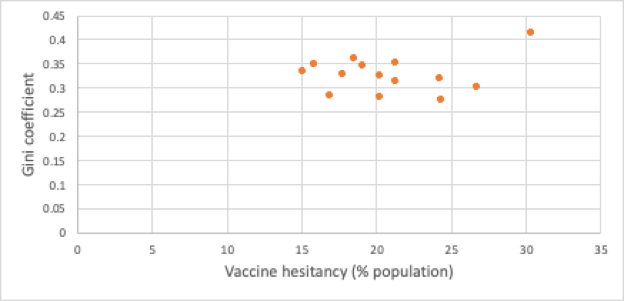 The simple fact is that there are too few countries where the World in Data is able to calculate vaccine hesitancy (given the unfairness of vaccine distribution globally, it really only makes sense to calculate hesitancy in developed economies and this dataset includes only 15 countries), and given these have clustered Gini coefficients, there is little that can be clearly concluded from the data. That is, other than it is notable that none of these nations – even the most equal and fair – has succeeded in convincing more than 85% of their populations that vaccination in the face of a dangerous virus is a good thing.