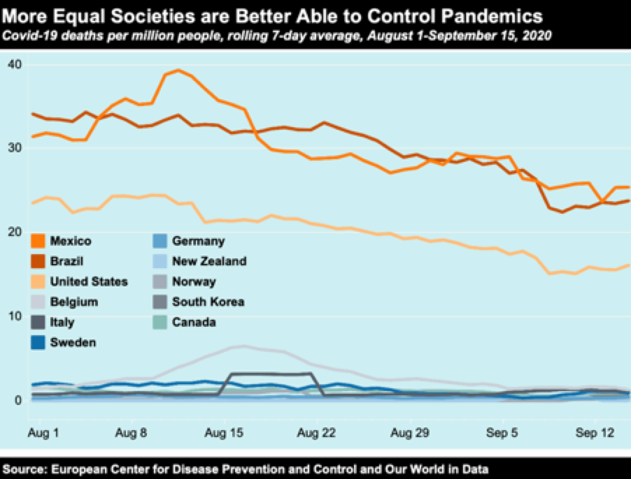 The scale of that lethality is potentially indicated in this chart. This is from the vigorous team at Inequality.org (part of the US’s Institute for Policy Studies) and it deliberately tells a powerful story, expressed in its blunt headline. It is clearly a dated snapshot, and is rather selective in its tendency to focus on North America and Europe, but the story it tells seems unlikely to be undermined by any update of the numbers, or cumulative deaths analysis, nor by the inclusion of some of the more obvious omissions (for example, China, India, Japan, South Africa and the UK).