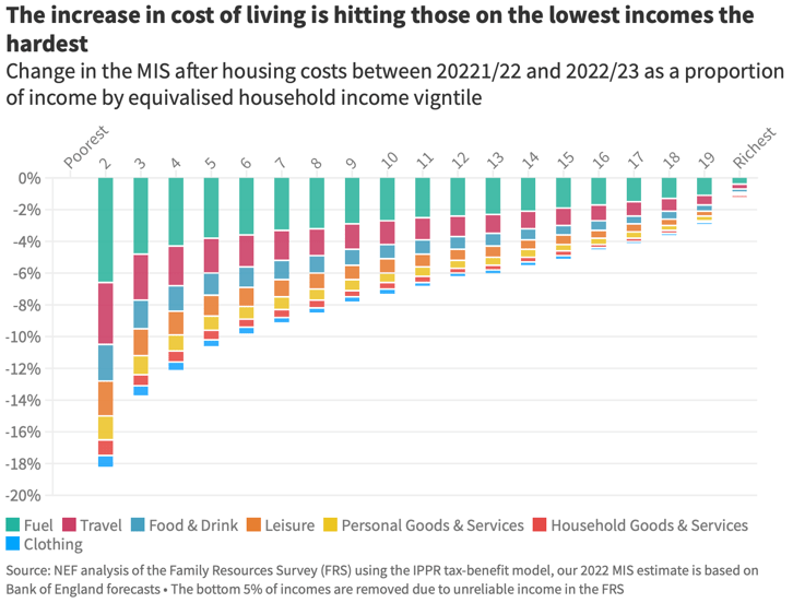The mere facts of these different experiences of economic life may be well understood, but the scale of it is not. The New Economics Foundation has produced two charts that bring this impact very fully to life. The first demonstrates the scale of the differential between those at different income levels, and the way in which the cost of living squeeze is a painful bear hug at the lowest income levels, while being not much more than a cuddle for the wealthy: