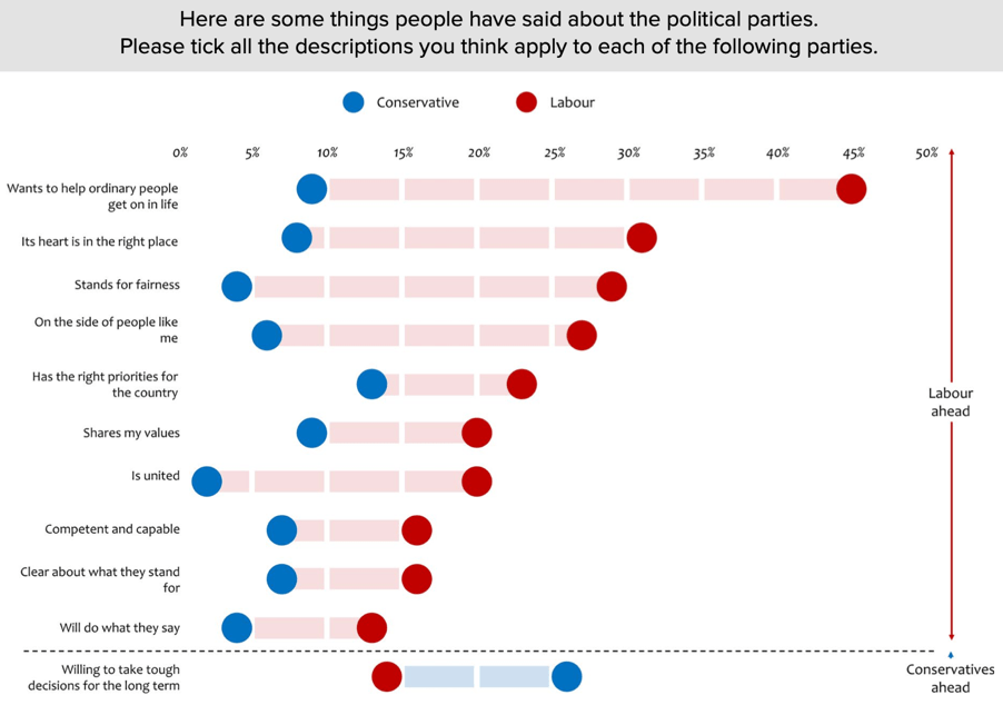 But the poll result is also pretty bad news for Labour. Their lead is impressive, but it more reflects the dire result for the Conservatives than a positive view of Labour. Overall, only 29% of people believe that they stand for fairness. Even among their supporters only a small majority believe that they do: 56% of those who supported them in 2019, and 59% of those likely to vote for them next time around. Under half of every other group of voters thinks the Labour Party stands for fairness.