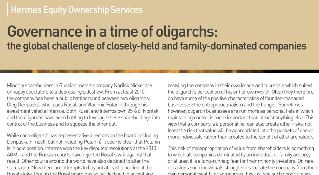 - Governance in a time of Oligarchs, published by Hermes, March 2012